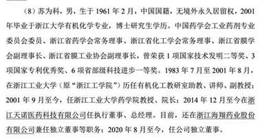 與黃法同時當選公司另外一名獨董蘇為科,招股書披露的其個人簡歷也同樣惹人關注。蘇為科的簡歷顯示,他目前還在浙江工業大學藥學院擔任教授、院長職務(見圖二)。