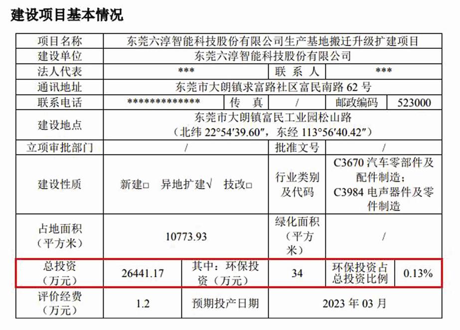 而根據(jù)東莞市生態(tài)環(huán)境局6月批前公示的公司環(huán)評報告(2021年4月編制、項目名稱東莞六淳智能科技股份有限公司電子產(chǎn)品精密功能性器件生產(chǎn)項目(遷建))中,建設(shè)項目基本情況顯示總投資28985.12萬元,其中環(huán)保投資100萬元,施工工期24個月,用地面積10773.93平米,均與公司核心募投項目相關(guān)信息一致(見圖三)。