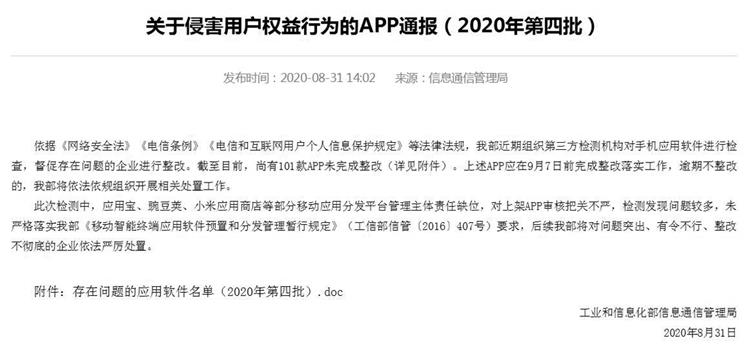 圖一:工信部網(wǎng)站《關(guān)于侵害用戶權(quán)益行為的APP通報(bào)(2020年第四批)》