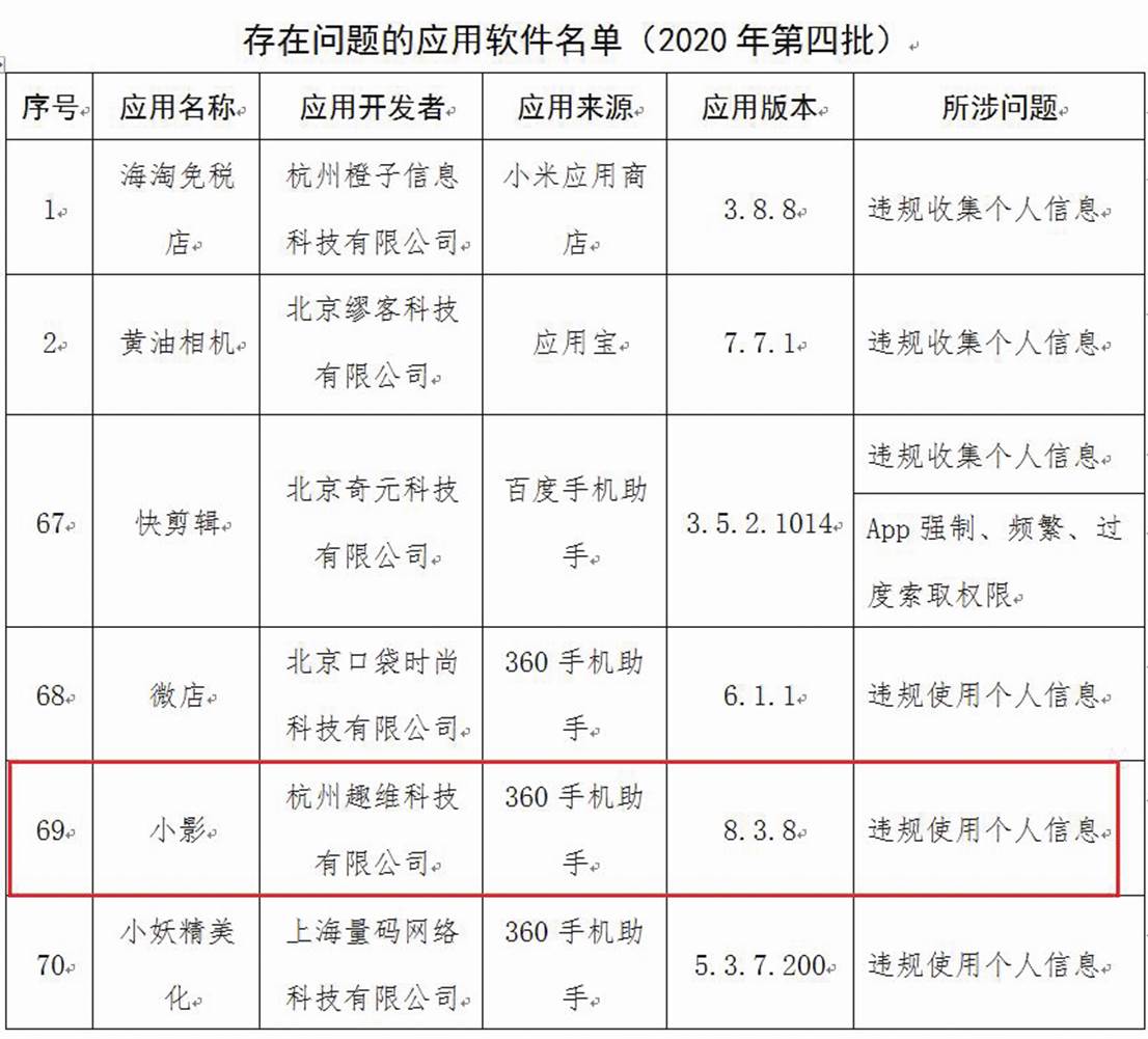 《大眾證券報(bào)》明鏡財(cái)經(jīng)工作室記者查詢發(fā)現(xiàn),2020年8月31日,工信部信息通信管理局公布了《關(guān)于侵害用戶權(quán)益行為的App通報(bào)(2020年第四批)》,其中趣維有限旗下運(yùn)營的短視頻剪輯軟件“小影”存在違規(guī)收集個(gè)人信息的問題,被要求限時(shí)整改。