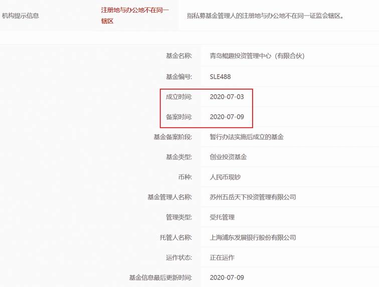 招股書顯示,2020年7月2日,趣維有限股東會作出決議,同意趣維有限新增注冊資本761989.13元,其中青島鯤趣新增出資額144550.78元,增資金額5600萬元。查詢證券投資基金業協會發現,青島鯤趣成立時間為2020年7月3日,備案時間為2020年7月9日(見圖一)。