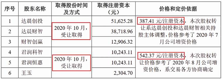 交易時間相同,但交易價格卻懸殊。從交易價格來看,達晨創投、達晨財智以及財智創贏以387.41元/注冊資本受讓股份,而君潤科智、君潤恒惠以及王玉以542.37元/注冊資本受讓股份(見圖三)。