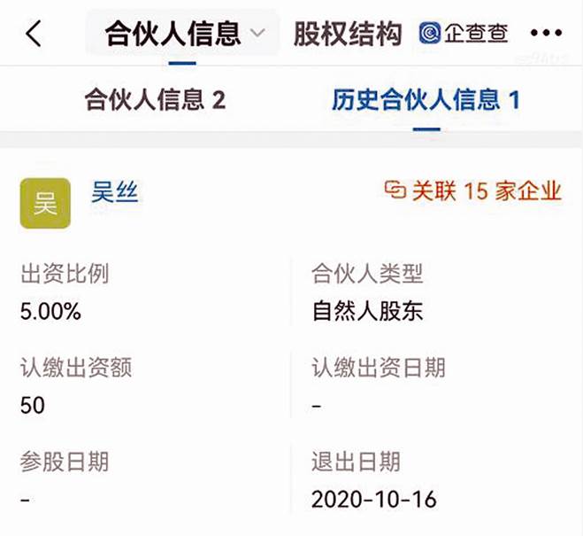 隨著吳絲2020年8月起陸續辭去科萊瑞迪董事、副總經理、董事會秘書、財務總監等要職后,吳絲也從邇特康(即上海邇特康企業管理合伙企業(有限合伙))退出。企查查查詢的邇特康歷史合伙人信息顯示,2020年10月16日,吳絲向科萊瑞迪實控人轉讓了其所持的邇特康5%出資額,旋即不再擔任邇特康執行事務合伙人(見圖四、圖五、圖六)。