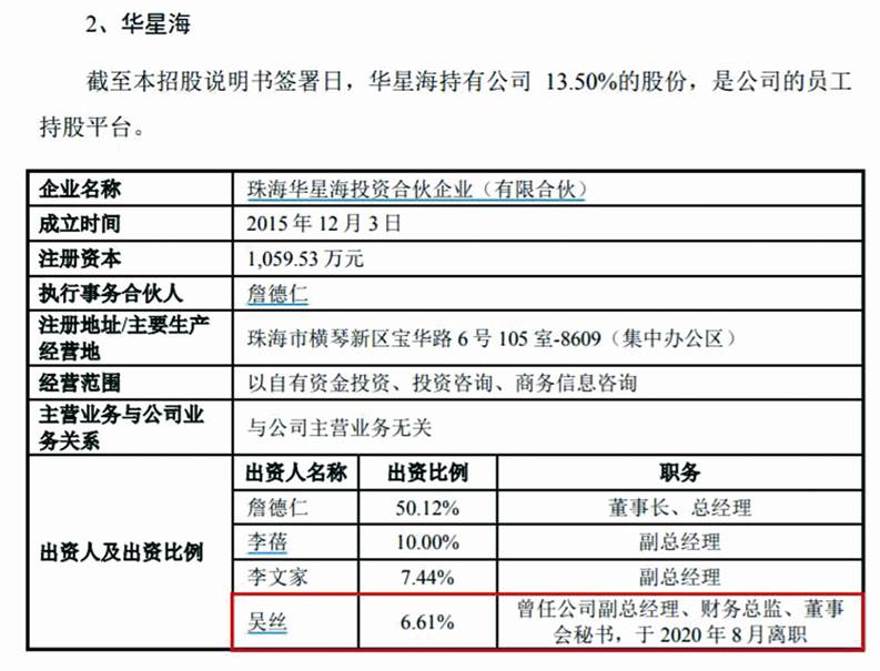 奇怪的是,2020年8月起辭去所有科萊瑞迪職務的吳絲,差不多時隔兩年,依然還在公司員工持股平臺華星海的合伙人名單中——吳絲出資比例為6.61%(見圖七),這在其他合伙人均為公司在職高管、職工的華星海中非常扎眼。截至科萊瑞迪最新招股書簽署日,華星海持有公司13.50%的股份,以此計算,從公司辭職快兩年的吳絲目前仍間接通過員工持股平臺持有科萊瑞迪0.89%的股份。