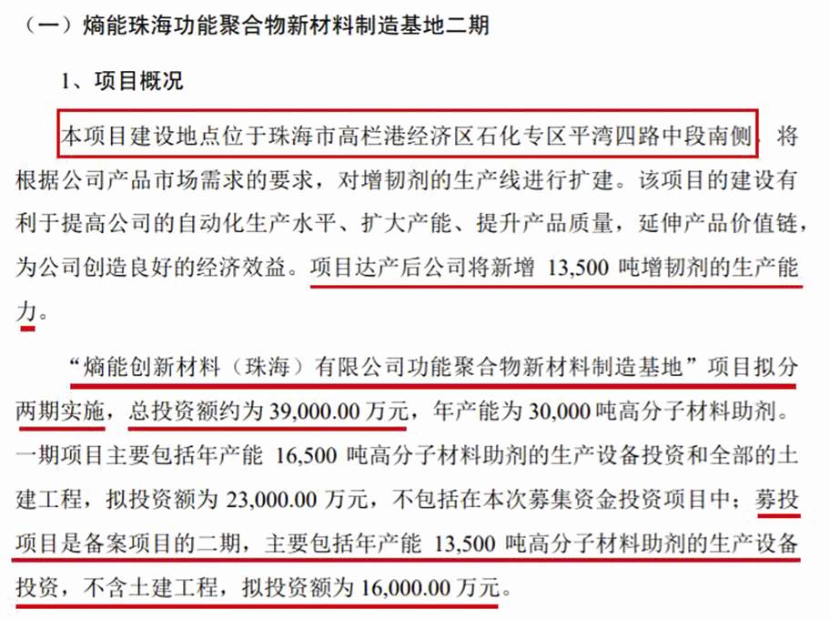 查閱最新招股書可見,公司此次核心募投項目,即熵能珠海基地二期的建設地點位于珠海市高欄港經濟區石化專區平灣四路中段南側,將根據公司產品市場需求,對增韌劑的生產線進行擴建,項目達產后公司將新增13500噸增韌劑的生產能力。具體來看,建設投資1.30億元,預備費及鋪底流動資金3000萬元,項目建設期為12個月。