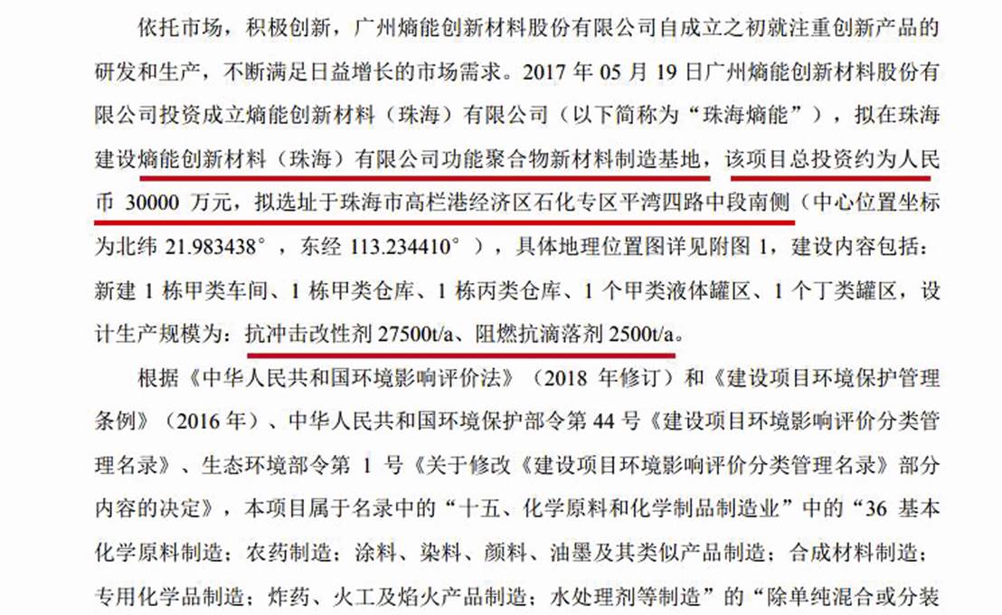 查閱珠海生態環境局的環評批復公示發現,2020年4月16日受理、當年6月5日批復同意的熵能珠海基地項目,設計年產功能聚合物新材料30000噸,其中抗沖擊改性劑27500噸/年(增韌劑屬于此類),阻燃抗滴落劑2500噸/年。