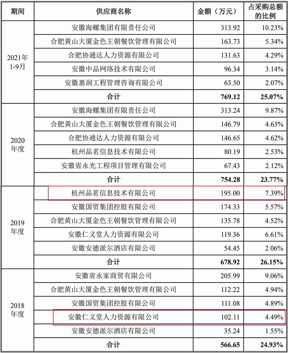 《大眾證券報》明鏡財經工作室記者發現,安天利信對人力資源服務供應商的采購金額在2019年至2021年前三季度一直穩定的處于100萬元至150萬元之間,然而,員工人數在報告期內相對最少的2018年,公司對安徽仁義堂人力資源有限公司的采購金額卻高達922.76萬元。更引人關注的是,922.76萬元為安天利信2018年年報披露的采購金額,而這一采購數據在招股書中僅披露為102.11萬元,招股書披露的同年第一大供應商為安徽省永家商貿有限公司,采購金額僅205.99萬元。