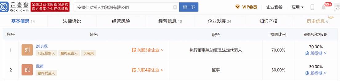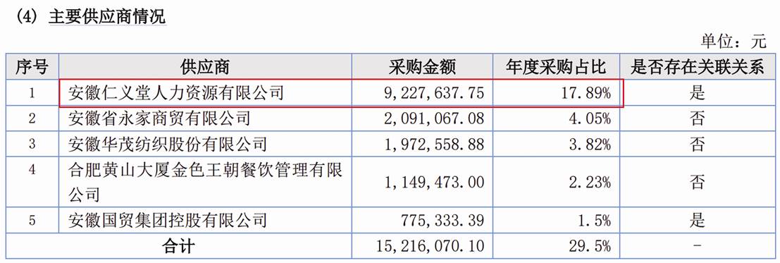 進一步查詢發現,安徽仁義堂人力資源有限公司為安天利信副董事長關聯人實際控制的企業,而在后期更換的人力資源服務供應商也是副董事長關聯企業。