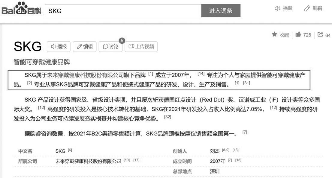 搜索SKG,百度百科詞條顯示為:“SKG屬于未來穿戴健康科技股份有限公司旗下品牌,成立于2007年,專注為個人與家庭提供智能可穿戴健康產(chǎn)品。專業(yè)從事SKG品牌可穿戴健康產(chǎn)品和便攜式健康產(chǎn)品的研發(fā)、設計、生產(chǎn)及銷售。”(見圖一)