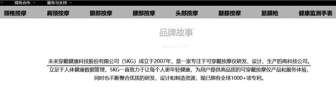 “SKG未來穿戴官網(wǎng)”在品牌故事中也宣稱:“未來穿戴健康科技股份有限公司(SKG)成立于2007年,是一家專注于可穿戴按摩儀研發(fā)、設計、生產(chǎn)的高科技公司。立足于人體健康數(shù)據(jù)管理,SKG一直致力于讓每個人更年輕健康,為用戶提供高品質的可穿戴按摩儀產(chǎn)品和服務體驗,同時也不斷整合優(yōu)質的研發(fā)、設計和制造資源,現(xiàn)已擁有全球1000+項專利。”(見圖二)