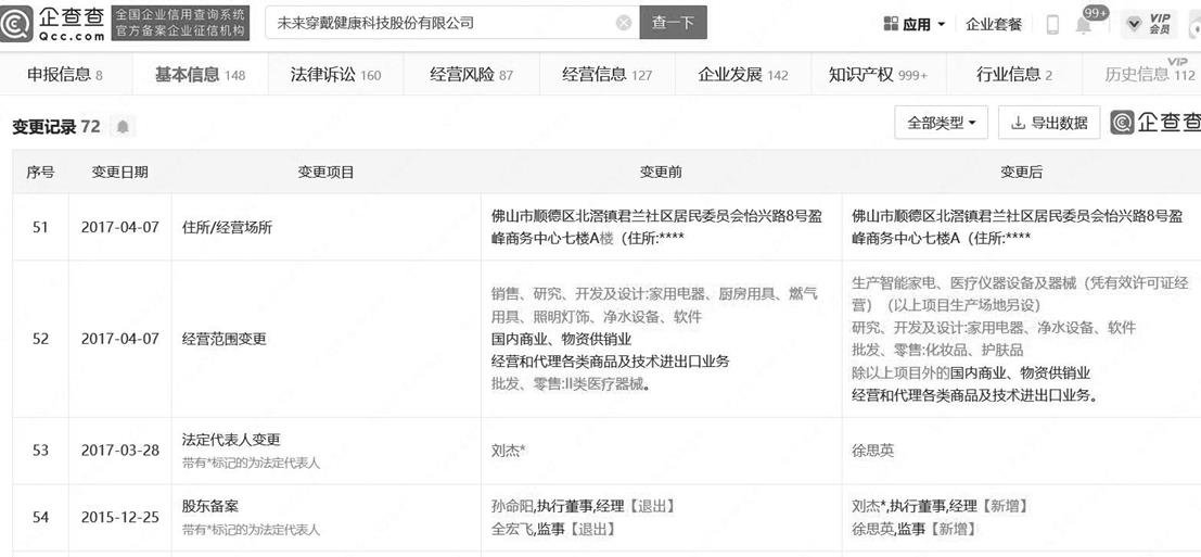 查詢未來穿戴的工商變更記錄可以發(fā)現(xiàn),公司2017年經(jīng)營范圍才增加“生產(chǎn)智能家電、醫(yī)療儀器設備及器械”(見圖三)。