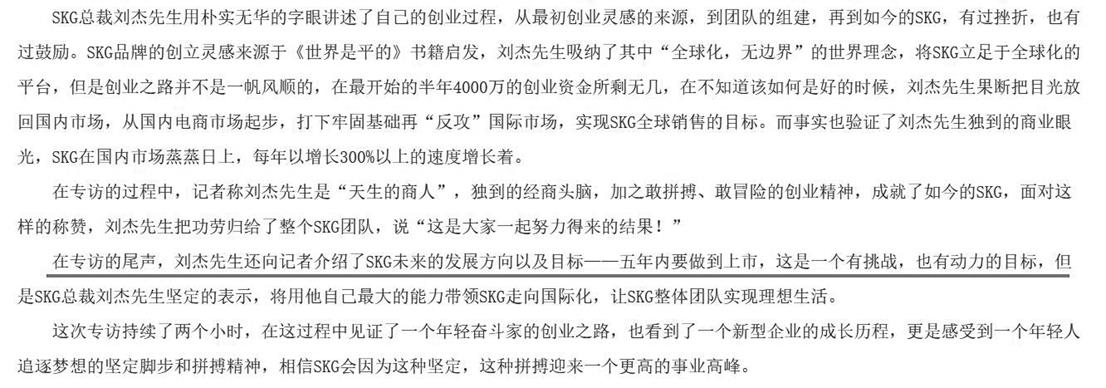 從以往的公開報道看,未來穿戴實際控制人劉杰早在2013年就有了上市打算,當時公司主營產(chǎn)品還不是現(xiàn)在的SKG按摩儀。2013年10月《順商》專訪SKG總裁劉杰,一個年輕奮斗家的歷程報道中提到:“在專訪的尾聲,劉杰先生還向記者介紹了SKG未來的發(fā)展方向以及目標——五年內要做到上市,這是一個有挑戰(zhàn),也有動力的目標,但是SKG總裁劉杰先生堅定的表示,將用他自己最大的能力帶領SKG走向國際化,讓SKG整體團隊實現(xiàn)理想生活?!?見圖五)