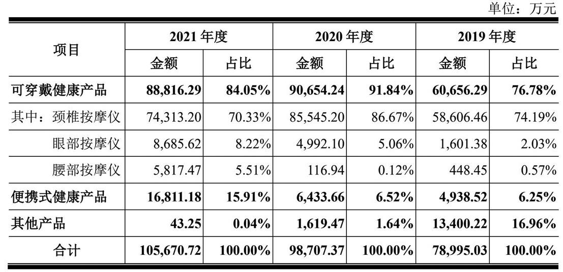 未來穿戴在招股書中表示,主營產(chǎn)品主要包括“可穿戴頸椎、腰部、眼部按摩儀,筋膜槍、健康手表等”。事實上,營收數(shù)據(jù)顯示,公司營收主要由頸椎按摩儀貢獻,報告期各期頸椎按摩儀收入占比分別為74.19%、86.67%及70.33%(見圖六)。而對于可以實現(xiàn)健康監(jiān)測的產(chǎn)品——健康手表的銷售收入及占比,未來穿戴在招股書中并未單列。招股書對R系列健康手表的介紹為,“搭載紅光傳感器,可為用戶提供指尖血壓趨勢測量、心血管健康狀態(tài)監(jiān)測、個人健康數(shù)據(jù)管理等功能服務”。