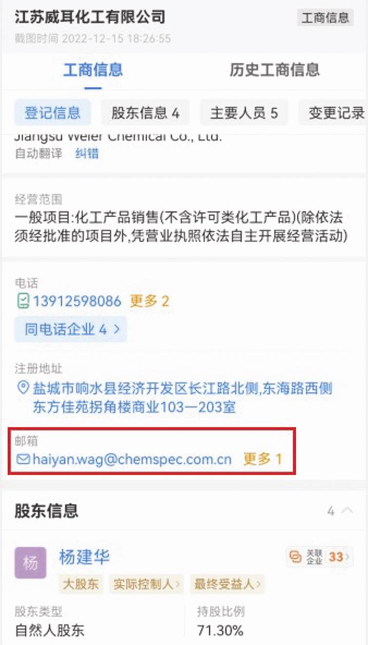 至于濱海康杰,其為江蘇威耳全資子公司,企查查查詢的工商登記信息顯示電郵也是haiyan.wang@chemspec.com.cn,官網(wǎng)則是https://www.chemspec.com.cn(見圖三)。該企業(yè)向當(dāng)?shù)厥斜O(jiān)機構(gòu)提交的企業(yè)年報顯示,2019-2021年的電郵均使用haiyan.wang@chemspec.com.cn,2016-2017年使用yuhe.su@chemspec.com.cn。