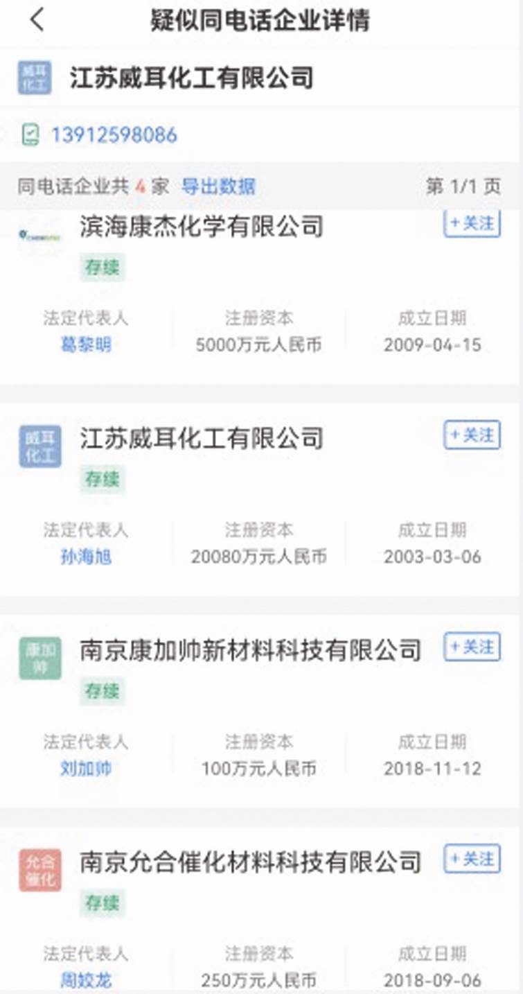 企查查顯示,江蘇威耳的工商登記信息中,使用郵箱為haiyan.wang @ chemspec.com.cn(見圖一),其向當(dāng)?shù)厥斜O(jiān)機構(gòu)提交的企業(yè)年報顯示,2013年來均使用電郵。該企業(yè)工商信息中聯(lián)系電話為13912598086,而相同電話企業(yè)還有濱海康杰,以及南京康佳帥新材料科技有限公司、南京允合催化材料科技有限公司(見圖二)。