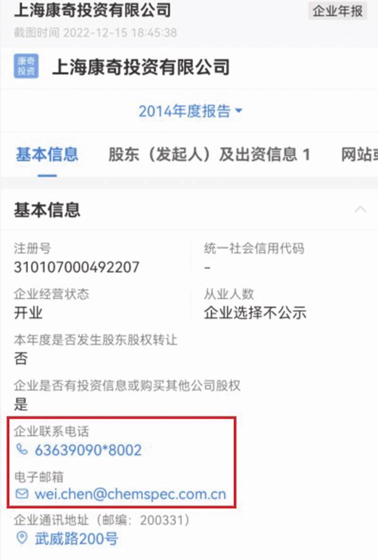 企查查顯示,上海康奇投資有限公司系楊建華個人獨資企業(yè),工商登記信息中電話與康鵬科技相同,電郵也是公司英文后綴的企業(yè)郵箱。其向當(dāng)?shù)厥斜O(jiān)機構(gòu)提交的企業(yè)年報顯示,除了未公示的年份,其余均顯示電郵為wei.chen@chemspec.com.cn。2013-2021年年報顯示企業(yè)聯(lián)系電話均使用021-63639090,2014年年報還顯示分機號為8002(見圖四)。