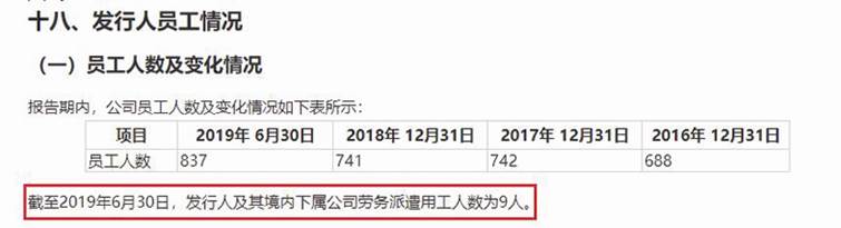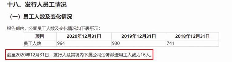 公司于2019年12月披露的招股書顯示,截至2019年6月30日,公司及其境內(nèi)下屬公司勞務(wù)派遣用工人數(shù)為9人(見圖六)。此后在2021年被否前的2021年3月招股書上會稿中披露,截至2020年12月31日,公司及其境內(nèi)下屬公司勞務(wù)派遣用工人數(shù)為16人(見圖七)。