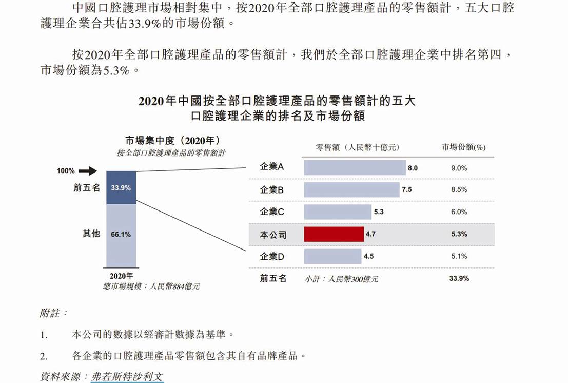 在招股書中說明行業地位時,薇美姿表示公司在全部口腔護理企業中排名第四:“根據弗若斯特沙利文的資料,以2020年全部口腔護理產品的零售額計,我們以5.3%的市場份額在中國口腔護理市場中排名第四。”(見圖一)