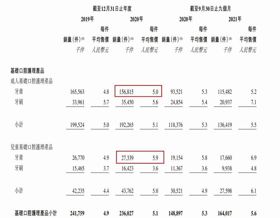 圖四:登康口腔招股書2021年牙膏前十廠商銷售額及銷量市場份額截圖