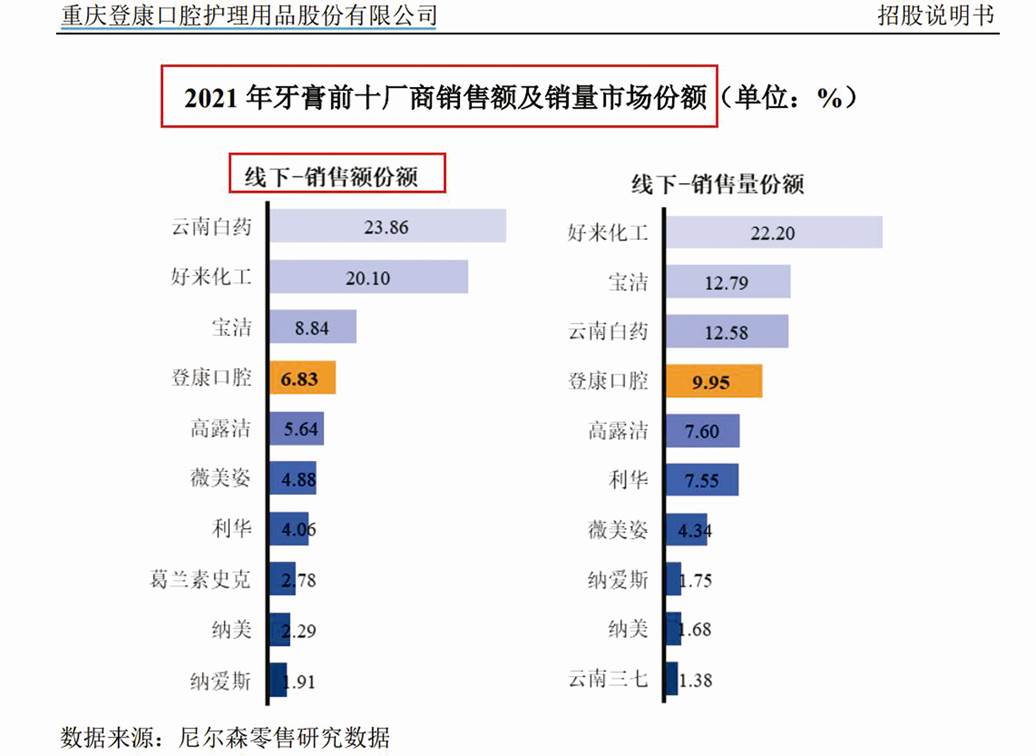 《大眾證券報》明鏡工作室記者查閱薇美姿、登康口腔招股書發現,兩公司2022年遞交的招股書中均稱自家“行業排名第四”,在論證行業地位時,兩公司引用的數據來源、統計口徑、統計年份均不同。更引人關注的是,登康口腔招股書披露的尼爾森零售研究數據圖表中,2020年,登康口腔牙膏線下渠道銷售額份額仍是排名第四,薇美姿位于第六,但若以2020年牙膏銷售額排名,登康口腔銷售額未超過薇美姿。登康口腔招股書中“2021年牙膏前十廠商銷售額及銷量市場份額”圖例標題下卻赫然列示的“線下-銷售額份額”排名圖表,登康口腔排名第四,或存誤導性陳述。