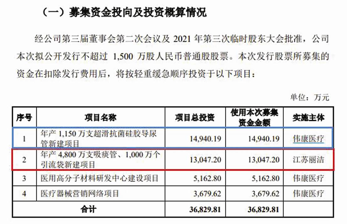 圖二:偉康醫療2022年8月招股書上會稿募投項目截圖