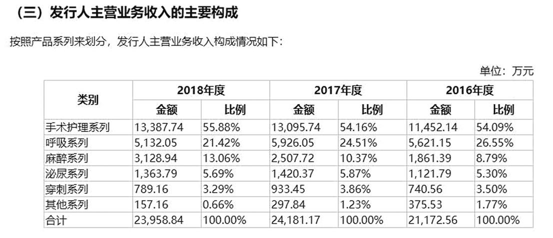 譬如公司近年營收最高的2019年時的主要產品中(見圖四),手術護理系列營收15855.39萬元、呼吸系列營收4828.94萬元、麻醉系列營收2689.17萬元、泌尿系列營收1267.82萬元、穿刺系列營收752.15萬元,較2018年增長的也只有手術護理系列、泌尿系列,其中主要依靠手術護理系列。公司2019年主要產品營收25434.23萬元、同比漲幅8%出頭,較2017年的24181.17萬元只增長不到5%,而2017年同比增幅接近15%。這意味著,結合2018年主要產品營收不到2.4億元,較2017年下降看(見圖五),公司在疫情前兩年的營收增速已現頹勢。