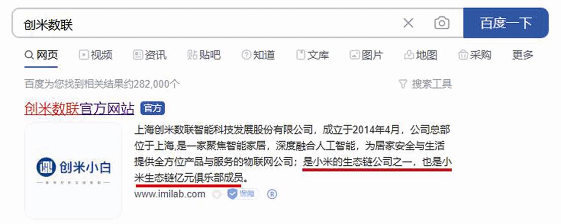 雖然創(chuàng)米數(shù)聯(lián)擁有自有品牌“創(chuàng)米小白”,但主要是小米定制智能攝像機、智能插座等產(chǎn)品的供應(yīng)商。在百度搜索創(chuàng)米數(shù)聯(lián)官網(wǎng)可見,公司明確表示“是小米的生態(tài)鏈公司之一,也是小米生態(tài)鏈億元俱樂部成員?!?見圖一)