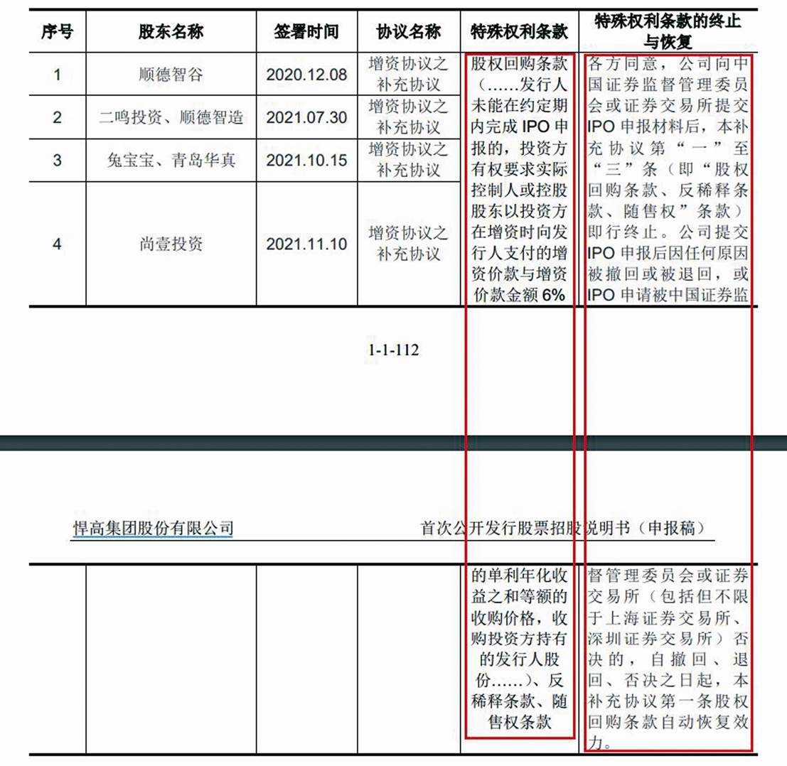 在今年1月更新的招股書(shū)中,悍高集團(tuán)更詳細(xì)地披露了股權(quán)回購(gòu)條款內(nèi)容:“股權(quán)回購(gòu)條款(……發(fā)行人未能在約定期內(nèi)完成IPO申報(bào)的,投資方有權(quán)要求實(shí)際控制人或控股股東以投資方在增資時(shí)向發(fā)行人支付的增資價(jià)款與增資價(jià)款金額6%的單利年化收益之和等額的收購(gòu)價(jià)格,收購(gòu)?fù)顿Y方持有的發(fā)行人股份……)、反稀釋條款、隨售權(quán)條款。”