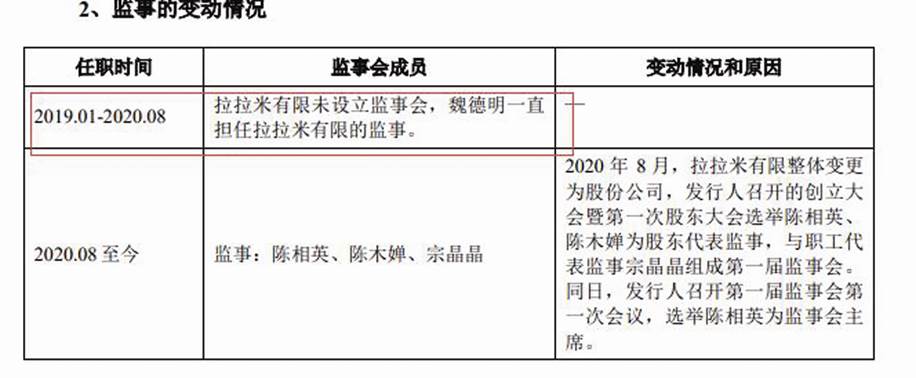 根據(jù)招股書, 2019年1月至2020年8月,拉拉米有限未設(shè)立監(jiān)事會,曾底價轉(zhuǎn)讓公司一半股權(quán)的魏德明則一直擔(dān)任拉拉米有限的監(jiān)事。 而2020年8月,公司召開創(chuàng)立大會暨第一次股東大會,選舉陳相英、陳木嬋為股東代表監(jiān)事,與職工代表宗晶晶組成第一屆監(jiān)事會。