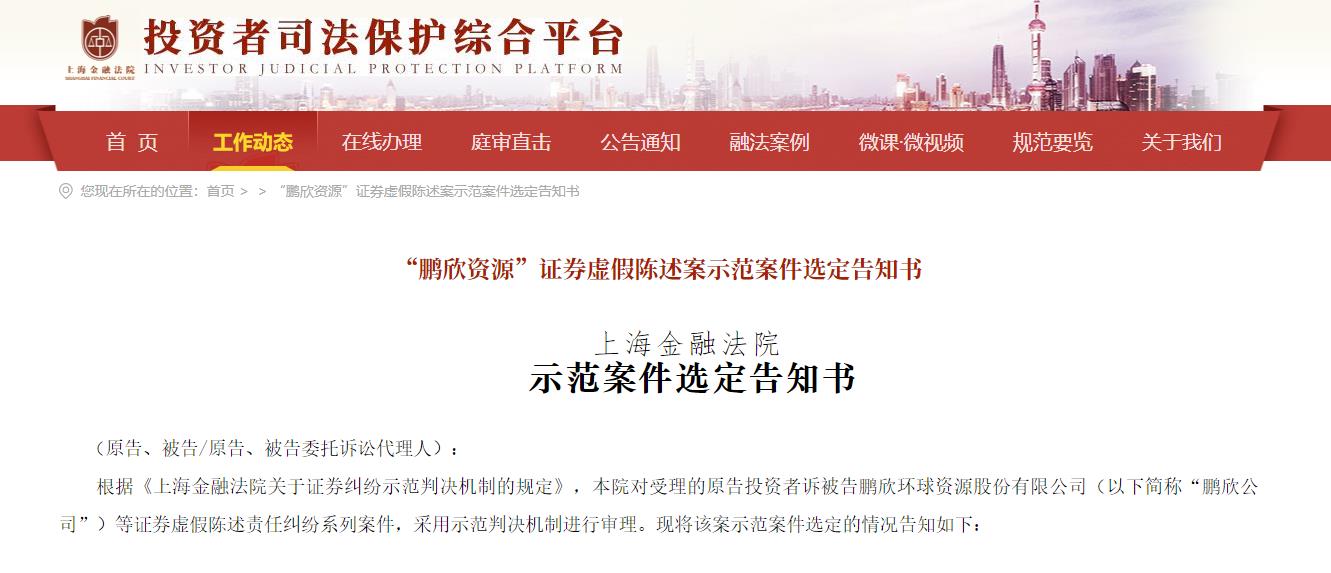 近日,鵬欣資源(600490)投資者索賠案?jìng)鱽砹诵逻M(jìn)展。據(jù)上海金融法院在官網(wǎng)發(fā)布的《示范案件選定告知書》顯示,法院對(duì)受理的原告投資者訴被告鵬欣資源等證券虛假陳述責(zé)任糾紛系列案件,采用示范判決機(jī)制進(jìn)行審理。