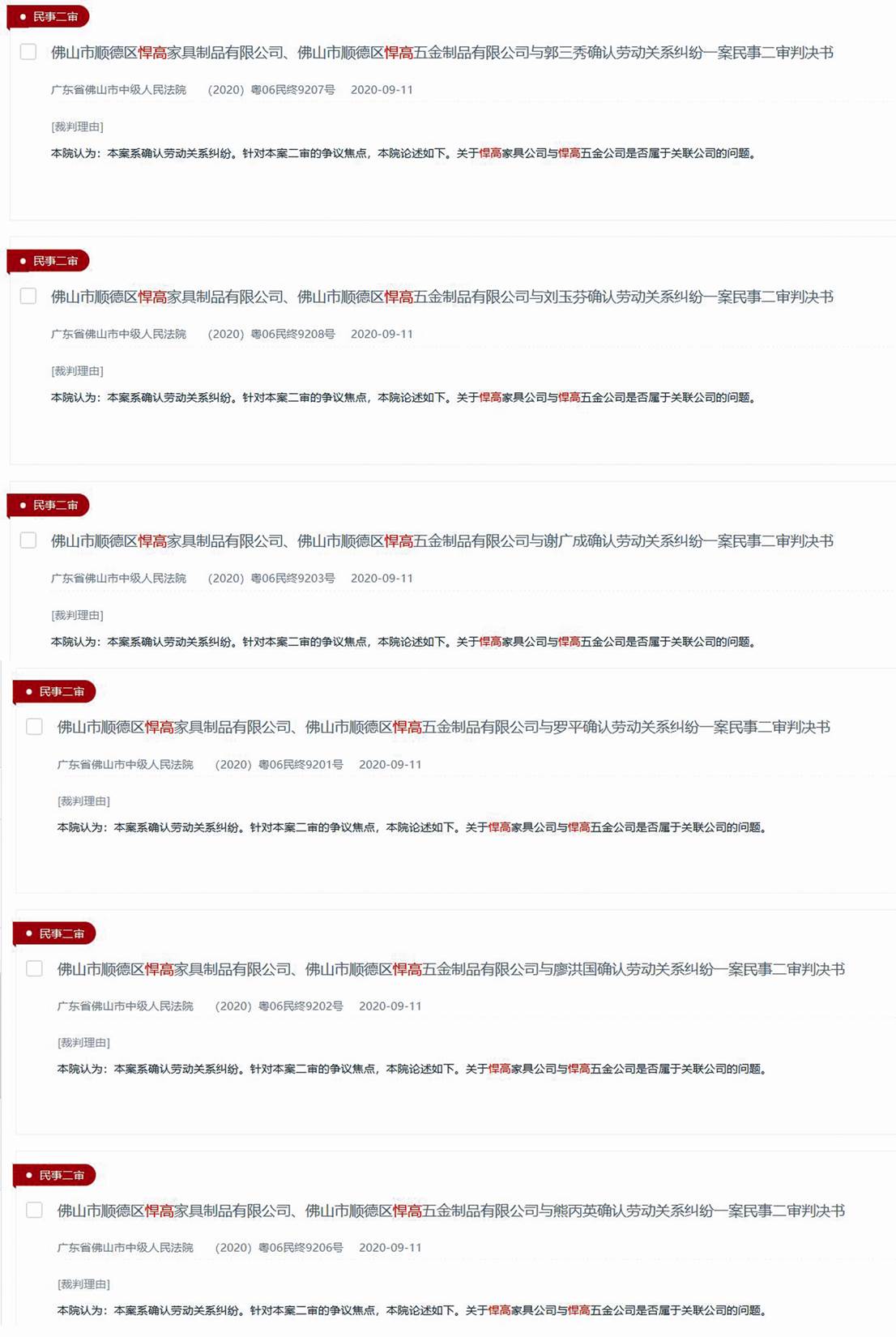 裁判文書網顯示,佛山市順德區悍高五金制品有限公司(悍高集團前身,以下簡稱“悍高五金公司”)及全資子公司佛山市順德區悍高家具制品有限公司(以下簡稱“悍高家具公司”)在2020年與汪美江、童云紅、郭三秀、劉玉芬、謝廣成、羅平、廖洪國、熊丙英等多名員工存在確認勞動關系糾紛(見圖一)。均為悍高家具公司、悍高五金公司不服一審判決,提起上訴,否認二者為關聯公司,但最終遭到佛山中院駁回,這不禁令人對企業信用產生疑問。