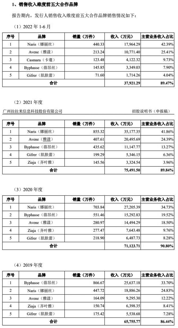而2022年1-6月,拉拉米前五大合作品牌出現(xiàn)了稍許改變,分別為Naris(娜麗絲)、Avene(雅漾)、Casmara(卡蔓)、Byphasse(蓓昂絲)、Gifrer(肌膚蕾),上述五大品牌的銷量分別為何440.33萬件、213.24萬件、123.48萬件、145.85萬件、71.60萬件,分別實現(xiàn)銷售收入1.80億元、1.08億元、4122.32萬元、3349.03萬元、1714.26萬元,主營業(yè)務(wù)合計占比達(dá)89.47%,對比此前的前五大品牌可見,位于2022年1-6月的第三大合作品牌Casmara(卡蔓)是首次躋身前五,而原有的Ziaja(齊葉雅)則從公司前五大品牌中退出。