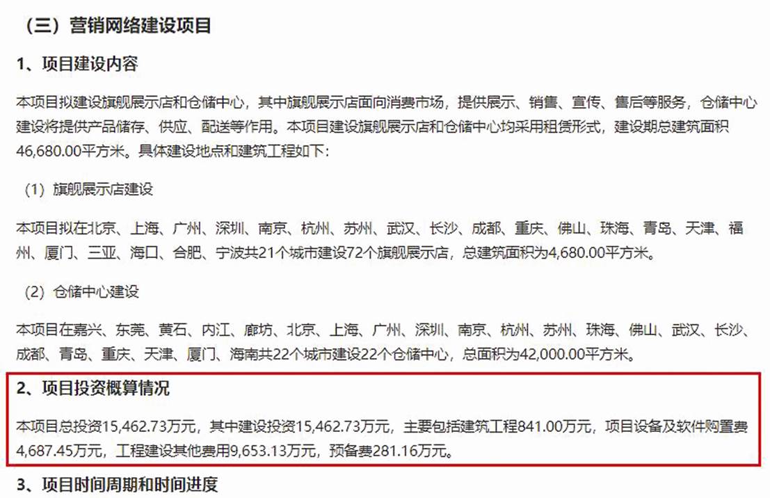 4、公司投資1.55億元的營銷網絡建設項目全部為大建旗艦店和倉儲中心,是否符合完整的營銷推廣工作實際,是否存在“圈錢”意味?
