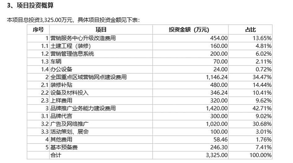 例如,森泰股份擬投資1146.24萬元的全國重點區域營銷網點建設費用中,裝修補貼為480萬元,設備及材料投入346.24萬元,上樣費用是320萬元。再看其投入資金最大的品牌推廣業務能力建設費用全部投資1420萬元中,品牌代言資金300.00萬元,廣告及網絡推廣1020.00萬元,活動策劃、展會投入100萬元。還有其營銷服務中心升級改造費用,總投資454萬元中,土建工程(裝修)160萬元,營銷管理信息系統投入200萬元,車輛支出70萬元、辦公設備投入24萬元。