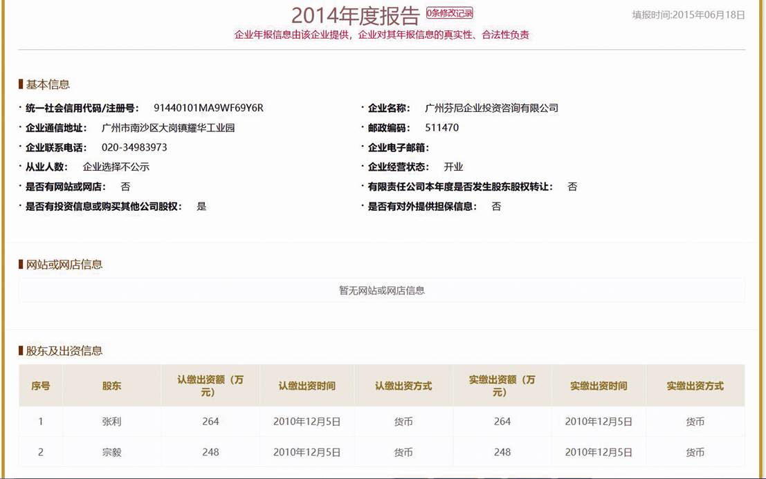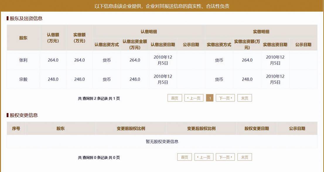 且在2014年年報(bào)股東及出資信息一欄中,股東也僅為張利、宗毅二人,分別認(rèn)繳出資額264萬元、248萬元,實(shí)繳出資時(shí)間均為2010年12月5日(見圖三)。需要指出的是,企業(yè)年報(bào)信息由該企業(yè)提供,企業(yè)對(duì)其年報(bào)信息的真實(shí)性、合法性負(fù)責(zé)。