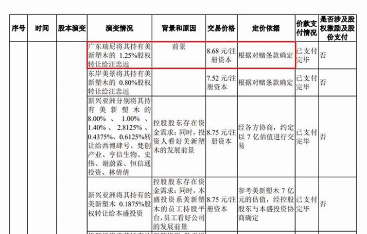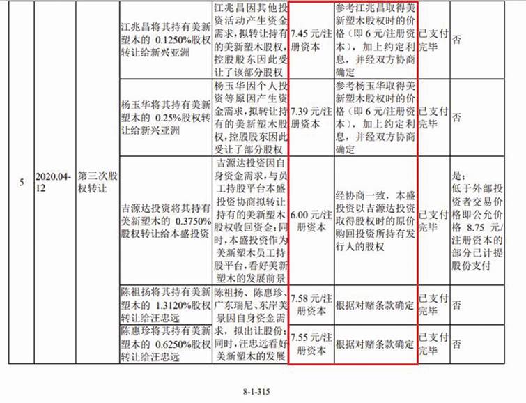 而另一次時間與吉源達投資差不多的股權轉讓,定價更是高于吉源達投資45%以上。2020年下半年,由于美新科技實際控制人控制的ERL(即東昇達有限公司,系公司的關聯企業)存在未償還公司貨款的情況,同時公司員工以及外部投資者西博肆號、梵創產業、亨信生物、史偉、謝蔚霖、恒信通投資、林倩倩、疌泉大亞、素值咨詢等看好公司未來發展,因此控股股東新興亞洲擬向公司員工以及外部投資者轉讓部分股權獲得資金,償還ERL所欠公司的貨款。綜合考慮公司業績及發展前景、行業估值等因素,經各方協商一致,同意以美新塑木估值7.00億元的價格進行交易,即8.75元/注冊資本。
