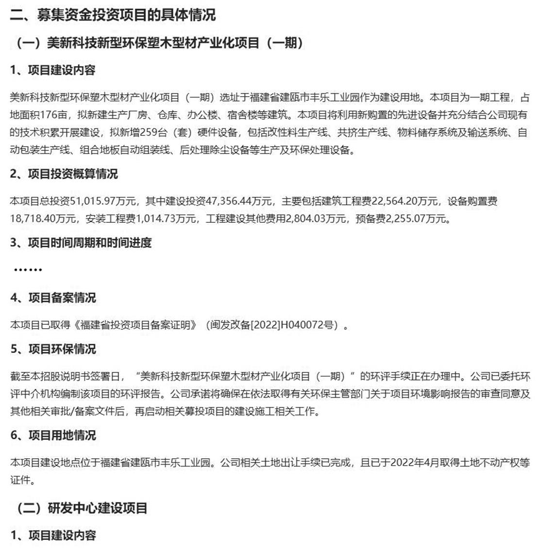 美新科技此次創業板IPO的核心募投項目為美新科技新型環保塑木型材產業化項目(一期),擬投資51015.97萬元,擬使用募資51015.97萬元,即全部用募資進行建設。