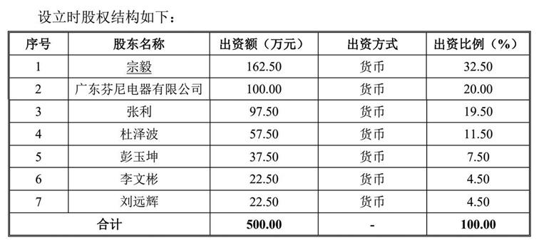 工商信息顯示,芬尼環保成立于2011年8月3日,注冊資本1000萬元,經營范圍:環保技術開發服務;機械工程設計服務;制冷、空調設備制造;家用通風電器具制造;專用設備修理;通用設備修理;專用設備安裝(電梯、鍋爐除外);商品批發貿易(許可審批類商品除外);商品零售貿易(許可審批類商品除外);貨物進出口(專營專控商品除外);技術進出口。公司設立時,宗毅、廣東芬尼電器有限公司、張利分別持股32.50%、20%、19.50%。