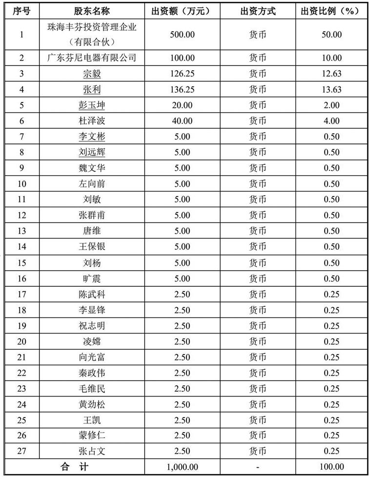 芬尼環保于2015年7月20日召開股東會,會議決議將原股東宗毅、杜澤波、彭玉坤、李文彬、劉遠輝持有的部分股份轉讓,并同意珠海豐芬投資管理企業(有限合伙)增資500萬元,增資后注冊資本達到1000萬元。具體如下:
