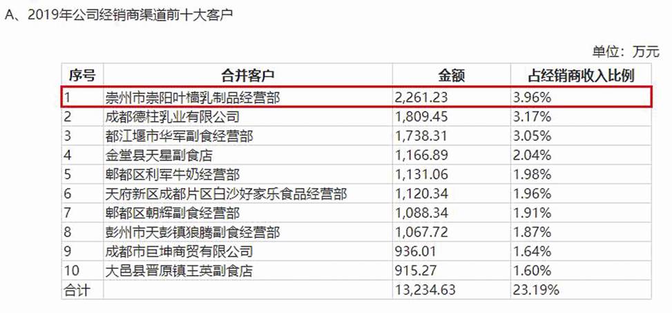 但是,翻閱菊樂股份2020年披露的招股書,則能看到公司2019年赫然向崇州市崇陽葉檣乳制品經營部的銷售金額為2261.23萬元(見圖一),這一數據與最新招股書披露的金額相差接近160萬元,差異率超過7%。