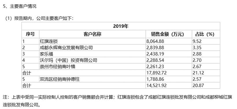 值得注意的還有,最新招股書中,2019年的第一至第四大客戶及其銷售金額分別為成都紅旗連鎖股份有限公司、7830.99萬元,永輝超市股份有限公司、2839.88萬元,荷蘭家樂福(中國)控股有限公司、2388.55萬元,沃爾瑪(中國)投資有限公司、2133.32萬元。這四家大客戶2019年的銷售金額與2020年招股書披露的同年數據絕大部分也不同。