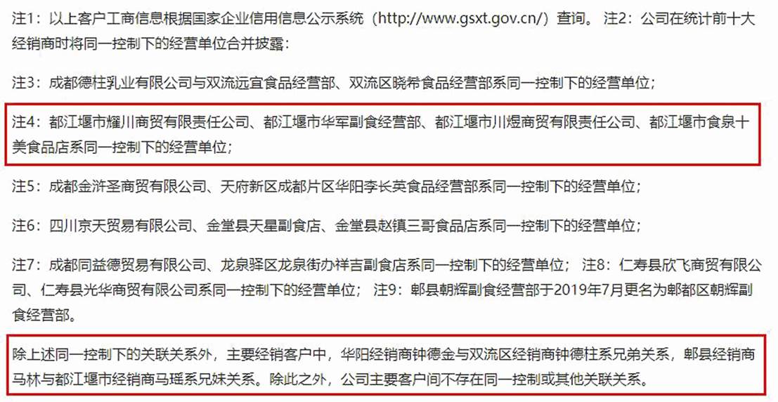 此外,公司2020年招股書還披露:“除上述同一控制下的關聯關系外,主要經銷客戶中,華陽經銷商鐘德金與雙流區經銷商鐘德柱系兄弟關系,郫縣經銷商馬林與都江堰市經銷商馬瑤系兄妹關系。除此之外,公司主要客戶間不存在同一控制或其他關聯關系。”(見圖四)