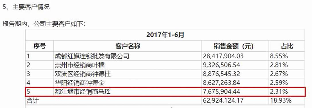 還有,菊樂股份2017年招股書顯示,2017年上半年都江堰市經銷商馬瑤為前五大客戶,銷售金額767.59萬元(見圖五),且“公司按銷售區域選定經銷商”、“經銷商銷售金額按受該經銷商控制的交易主體合并披露。”