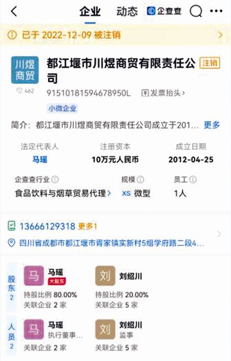 通過企查查查詢顯示,馬瑤為2012年4月成立的都江堰市川煜商貿有限責任公司持股80%股東、法定代表人、執行董事、總經理。