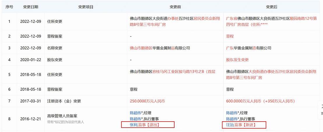 華雷金屬股東、監事曾是張利。廣東華雷金屬制造有限公司歷史股東還顯示,張利曾持股20%,2020年1月才退出(見圖二)。通過企查查查詢的企業變更記錄顯示,2016年12月,華雷金屬監事由張利變更為汪治(見圖三)。