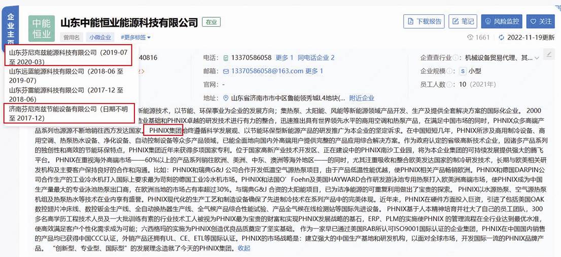 工商信息顯示,山東中能恒業能源科技有限公司自2011年成立至2017年12月曾用名為“濟南芬尼克茲節能設備有限公司”,此后在2019年7月至2020年3月曾用名為“山東芬尼克茲能源科技有限公司”。企查查APP顯示的該企業簡介為:“PHNIX集團——全身心致力于新能源技術,以節能、環保事業為企業的發展方向;集熱泵、太陽能、風能等新能源領域產品開發、生產及提供全套解決方案的國際化企業……”(見圖五)
