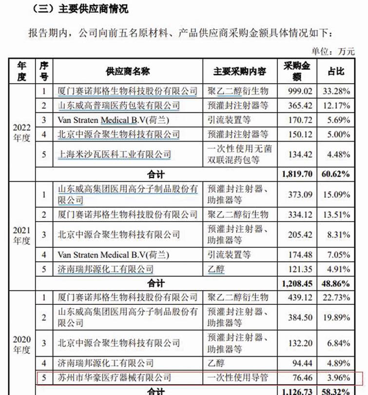 根據(jù)招股書,蘇州市華豪醫(yī)療器械有限公司為賽克賽斯2020年的第五大供應(yīng)商,公司向其采購一次性導(dǎo)管,采購金額76.46萬元,采購金額占比為3.96%(見圖一)。