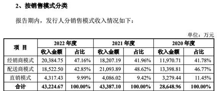 2020-2022年,賽克賽斯向前員工控制的這些核心經(jīng)銷商合計(jì)實(shí)現(xiàn)銷售收入分別為5887.22萬元、7789.86萬元、8710.15萬元,占主營業(yè)務(wù)收入構(gòu)成分別為20.55%、17.95%、20.15%。可以看出,公司向前員工控制的核心經(jīng)銷商進(jìn)行的銷售,合計(jì)收入呈現(xiàn)上升趨勢,差不多是公司主營業(yè)務(wù)收入的五分之一左右,結(jié)合公司營銷模式在主營業(yè)務(wù)的收入占比不足五成的數(shù)據(jù),有前員工控制的核心經(jīng)銷商幾乎占據(jù)了公司經(jīng)銷模式的“半壁江山”(見圖三)。