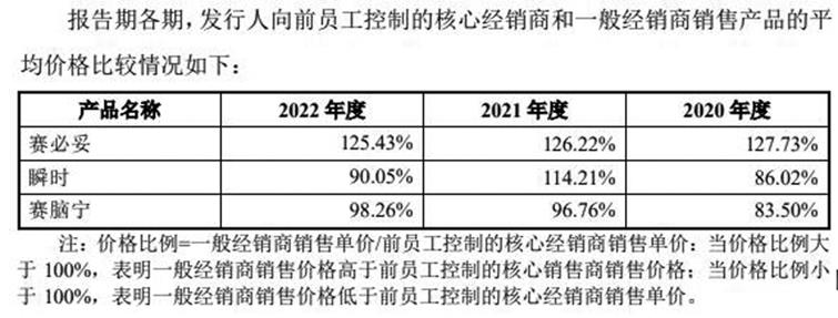 賽克賽斯招股書還顯示,報(bào)告期內(nèi),公司向前員工控制的核心經(jīng)銷商銷售產(chǎn)品包括賽必妥、瞬時(shí)、賽腦寧等產(chǎn)品。2020-2022年,公司向其銷售的上述產(chǎn)品的合計(jì)收入占向前員工控制的核心經(jīng)銷商銷售金額的比例分別為92.33%、92.31%和94.17%。