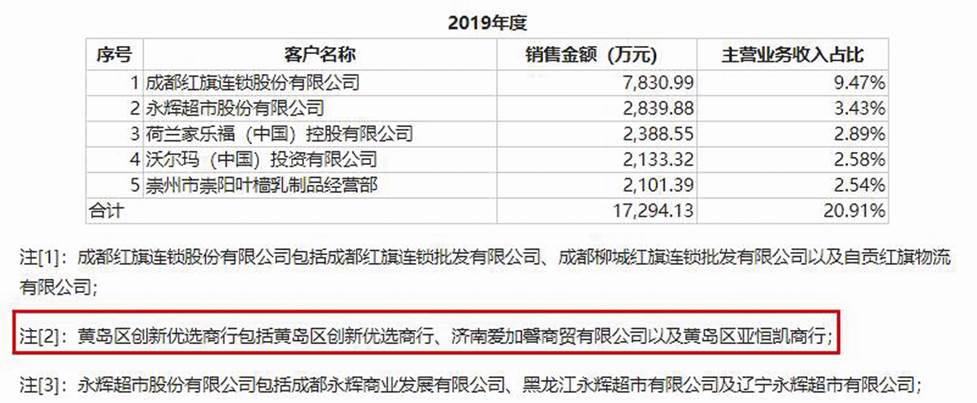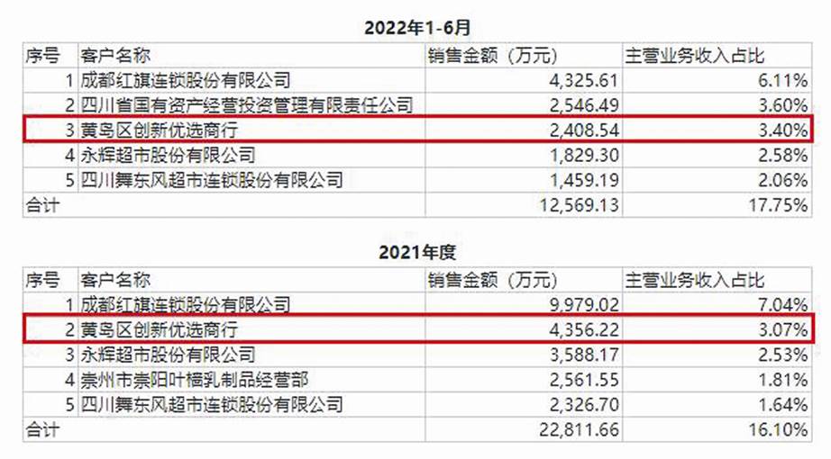 有待菊樂股份解惑的還有——黃島區創新優選商行及其關聯企業是否只是惠豐乳品經銷商,又是否是惠豐乳品最重要的經銷商,其何時起成為惠豐乳品經銷商客戶?公司披露的相關企業中只有一家成立于2014年4月,其余均成立于2020年四季度,2021年的銷售便超過4356萬元力壓永輝成為公司第二大客戶,是否正常、合理?